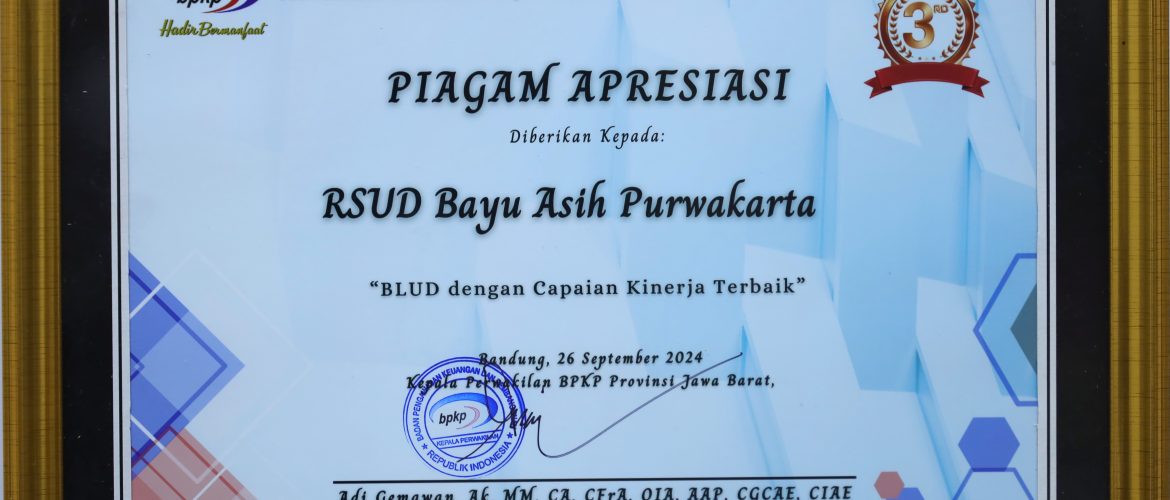 RSUD Bayu Asih meraih Piagam Apresiasi sebagai “BLUD dengan Capaian Kinerja Terbaik” dari BPKP Perwakilan Provinsi Jawa Barat, pada Acara Workshop Penguatan Tata Kelola BUMD, BLU/BLUD Layanan Kesehatan dan BUMDES di Aula Kantor Perwakilan BPKP Provinsi Jawa Barat, Kamis 26 September 2024. Pada acara tersebut dihadiri jajaran direksi BUMD hingga BLU/BLUD, pejabat dan peserta workshop lain yang hadir secara daring. Dikutip dari TVRI Jawa Barat, Dr. Sally Salamah selaku Deputi Kepala Bidang Akuntan Negara, menyampaikan “Peran BPKP adalah melakukan pembinaan dan