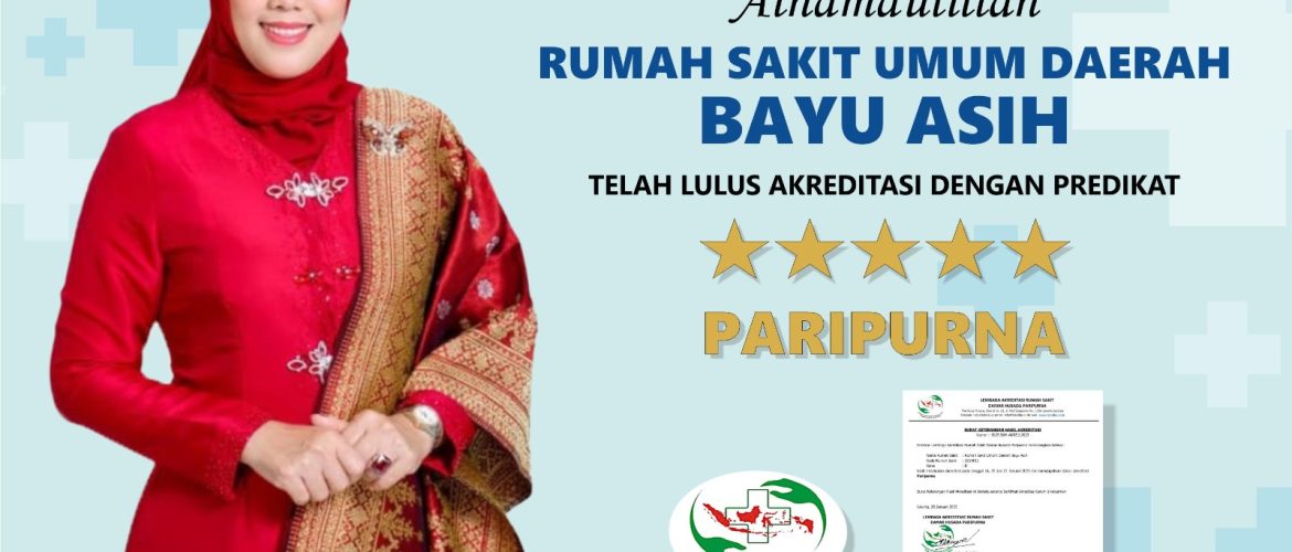 PARIPURNA. RSUD Bayu Asih telah lulus Akreditasi dengan Predikat PARIPURNA, hasil tersebut dikeluarkan dalam Surat Keterangan Hasil Akreditasi, nomor 0025.SKH-AKRE.I.2023, tanggal 28 Januari 2023, dari Lembaga Akreditasi Rumah Sakit Damar Husada Paripurna (LARS-DHP). Survei yang dilaksanakan pada tanggal 16, 20 dan 21 Januari 2023 dengan metode daring pada hari pertama survei telusur dokumen dilanjutkan dengan metode luring pada hari kedua dan ketiga survei telusur lapang. Setiap BAB medapat Skor dengan rata-rata 90%, dengan beberapa perbaikan yang harus dilakukan supaya mencapai